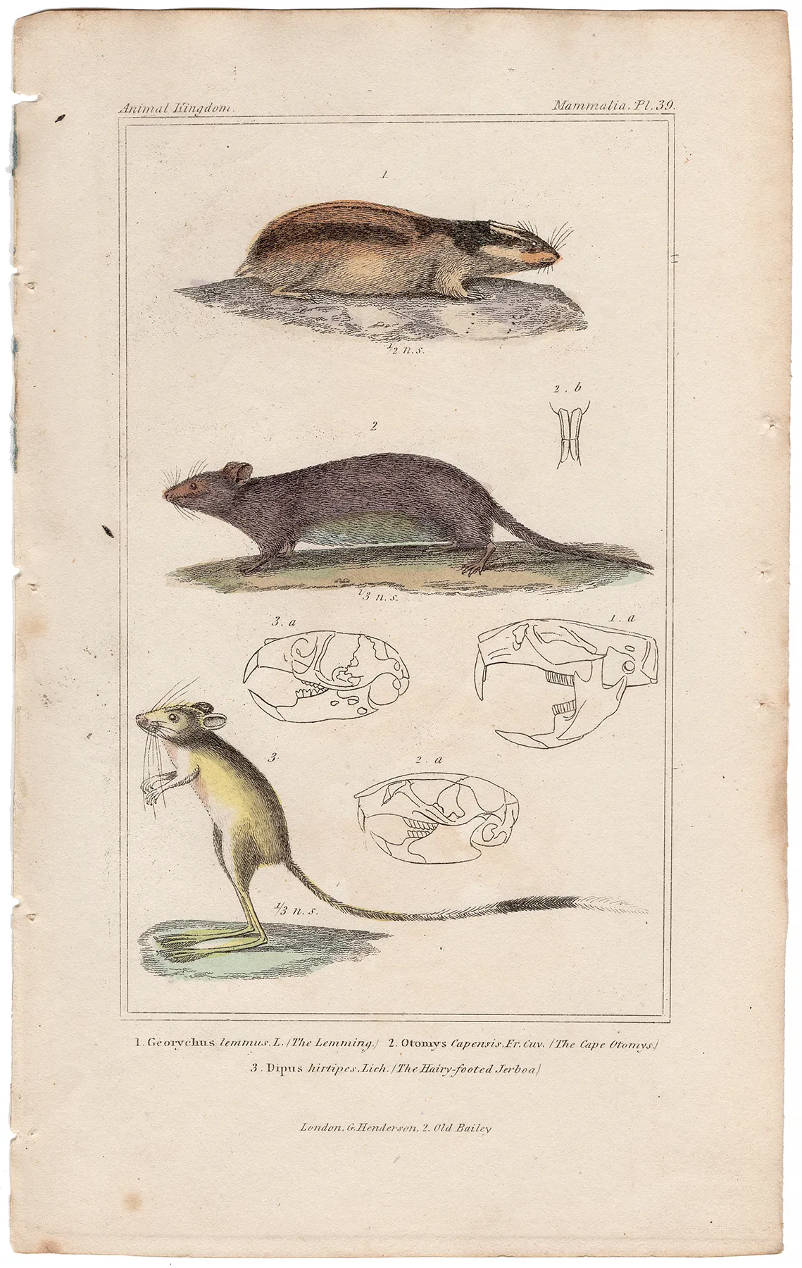 Cuvier Animal Kingdom Mammalia Plate 39 Lemming, Cape Otomys, Hairy-footed Jerboa