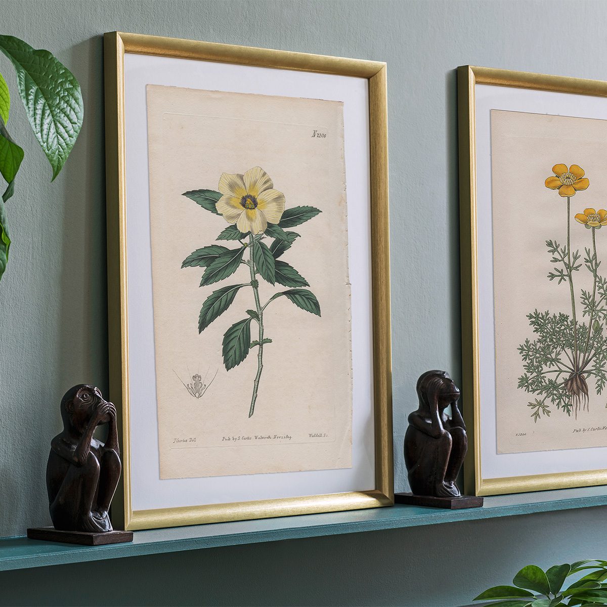 Brighten any room with a mixture of framed botanical illustration from Curtis’s Botanical Magazine. In the center is a fine art print showcasing American native plants from illustrations in Curtis’s Botanical Magazine. The smaller prints are octavo size and double octavo size hand-colored engravings from early volumes of Curtis’s Botanical Magazine.