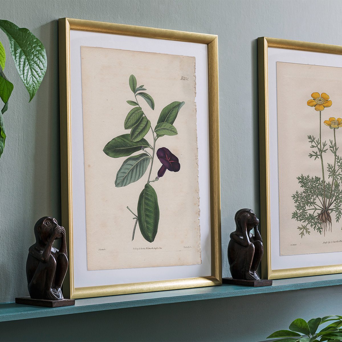 Brighten any room with a mixture of framed botanical illustration from Curtis’s Botanical Magazine. In the center is a fine art print showcasing American native plants from illustrations in Curtis’s Botanical Magazine. The smaller prints are octavo size and double octavo size hand-colored engravings from early volumes of Curtis’s Botanical Magazine.