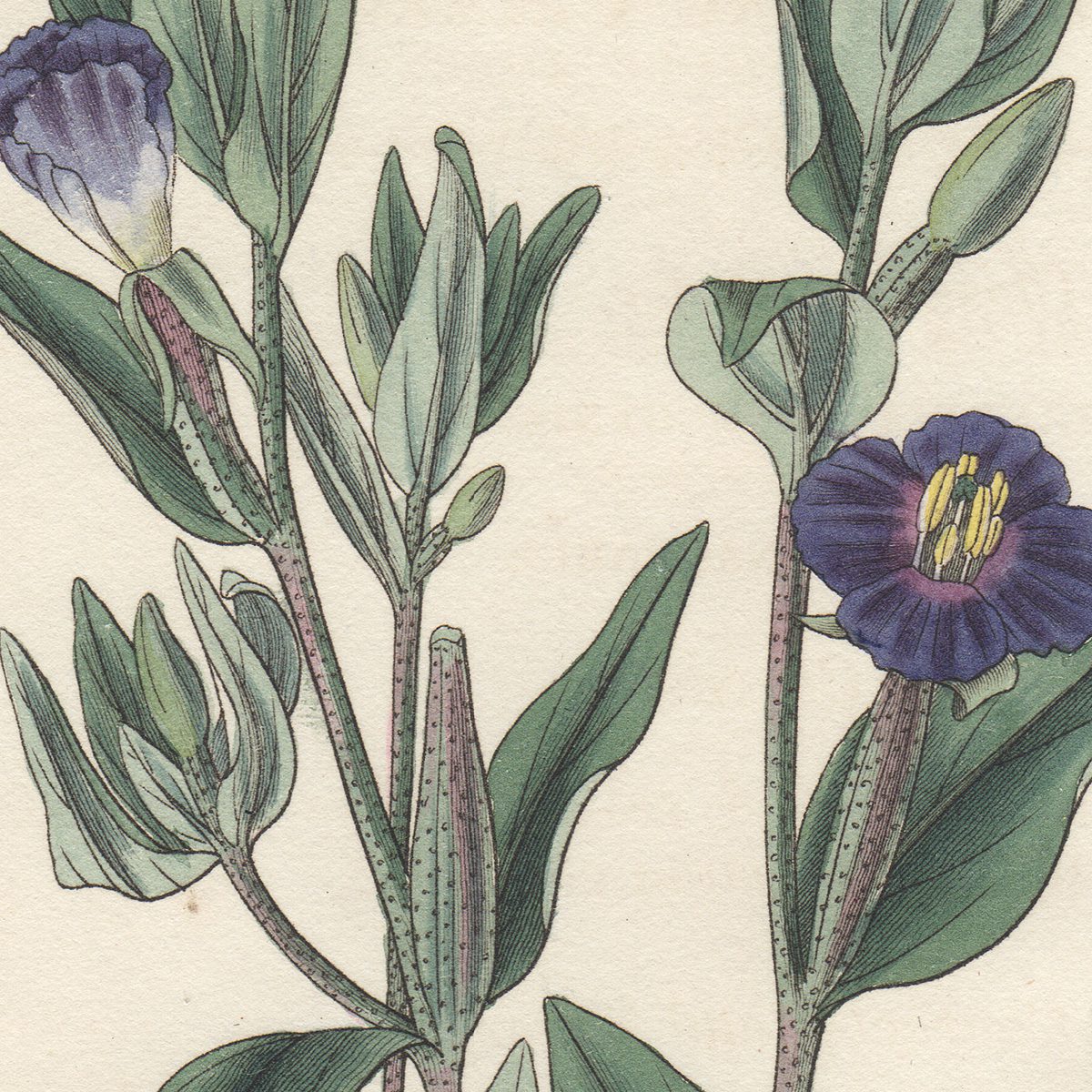 This original hand-colored engraving from Curtis’s Botanical Magazine, or Flower-Garden Displayed created in 1829 by William Jackson Hooker illustrates flowering plants.