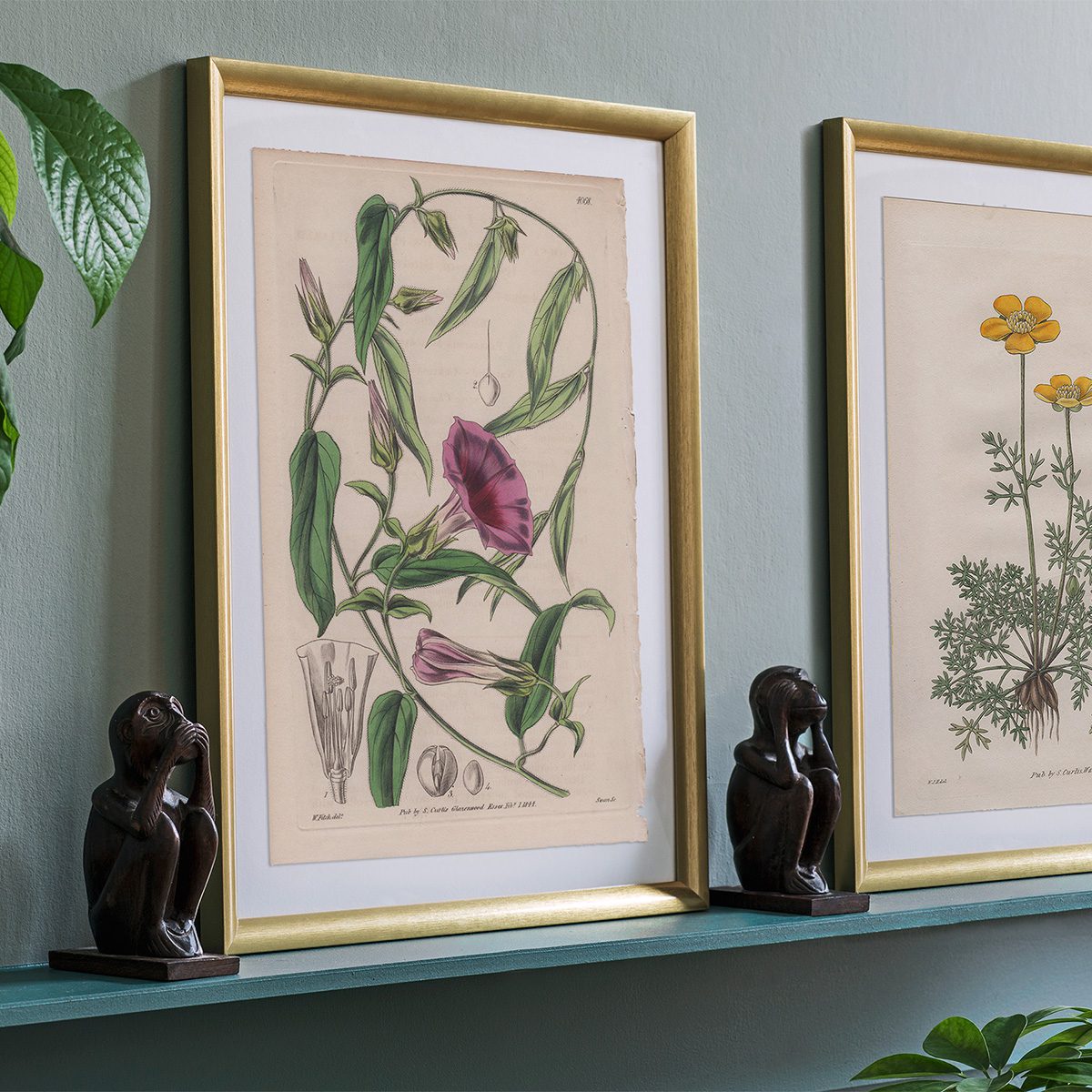 Brighten any room with a mixture of framed botanical illustration from Curtis’s Botanical Magazine. In the center is a fine art print showcasing American native plants from illustrations in Curtis’s Botanical Magazine. The smaller prints are octavo size and double octavo size hand-colored engravings from early volumes of Curtis’s Botanical Magazine.