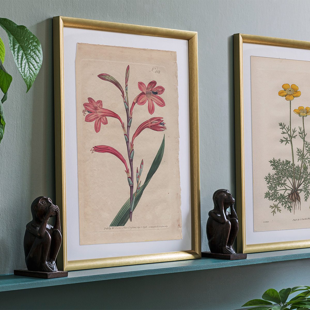 Brighten any room with a mixture of framed botanical illustration from Curtis’s Botanical Magazine. In the center is a fine art print showcasing American native plants from illustrations in Curtis’s Botanical Magazine. The smaller prints are octavo size and double octavo size hand-colored engravings from early volumes of Curtis’s Botanical Magazine.