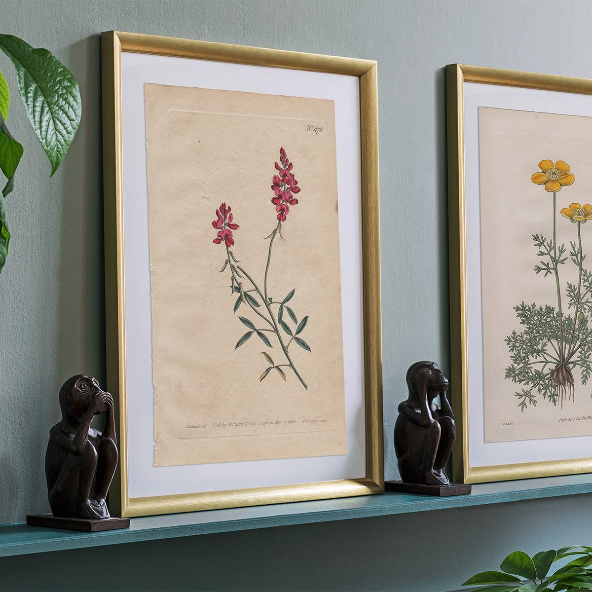Brighten any room with a mixture of framed botanical illustration from Curtis’s Botanical Magazine. In the center is a fine art print showcasing American native plants from illustrations in Curtis’s Botanical Magazine. The smaller prints are octavo size and double octavo size hand-colored engravings from early volumes of Curtis’s Botanical Magazine.