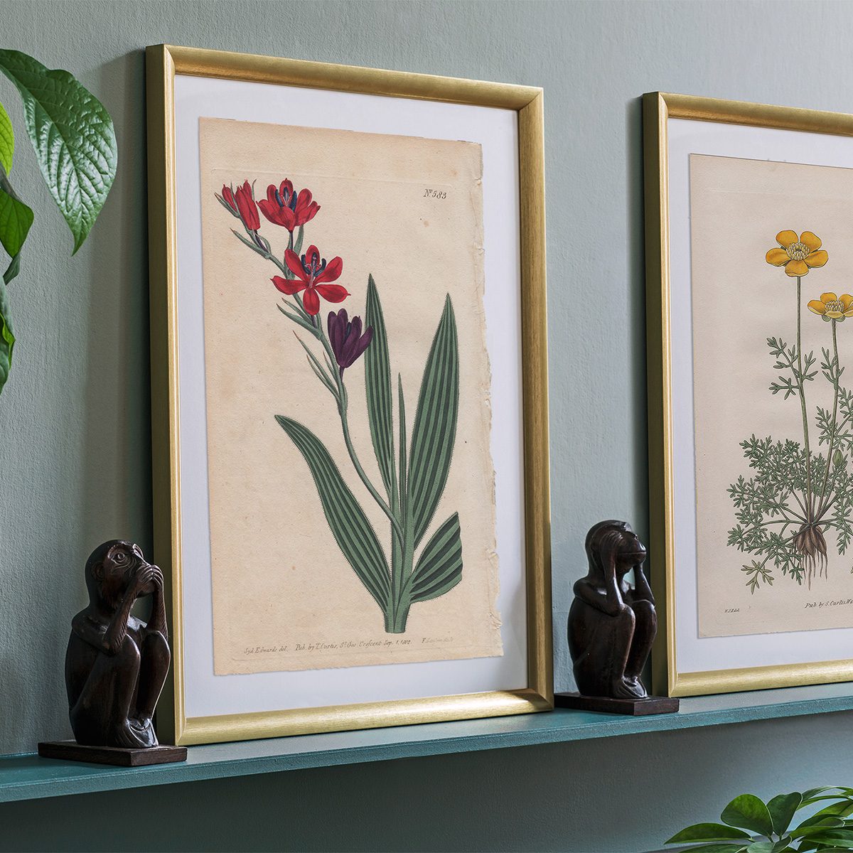 Brighten any room with a mixture of framed botanical illustration from Curtis’s Botanical Magazine. In the center is a fine art print showcasing American native plants from illustrations in Curtis’s Botanical Magazine. The smaller prints are octavo size and double octavo size hand-colored engravings from early volumes of Curtis’s Botanical Magazine.
