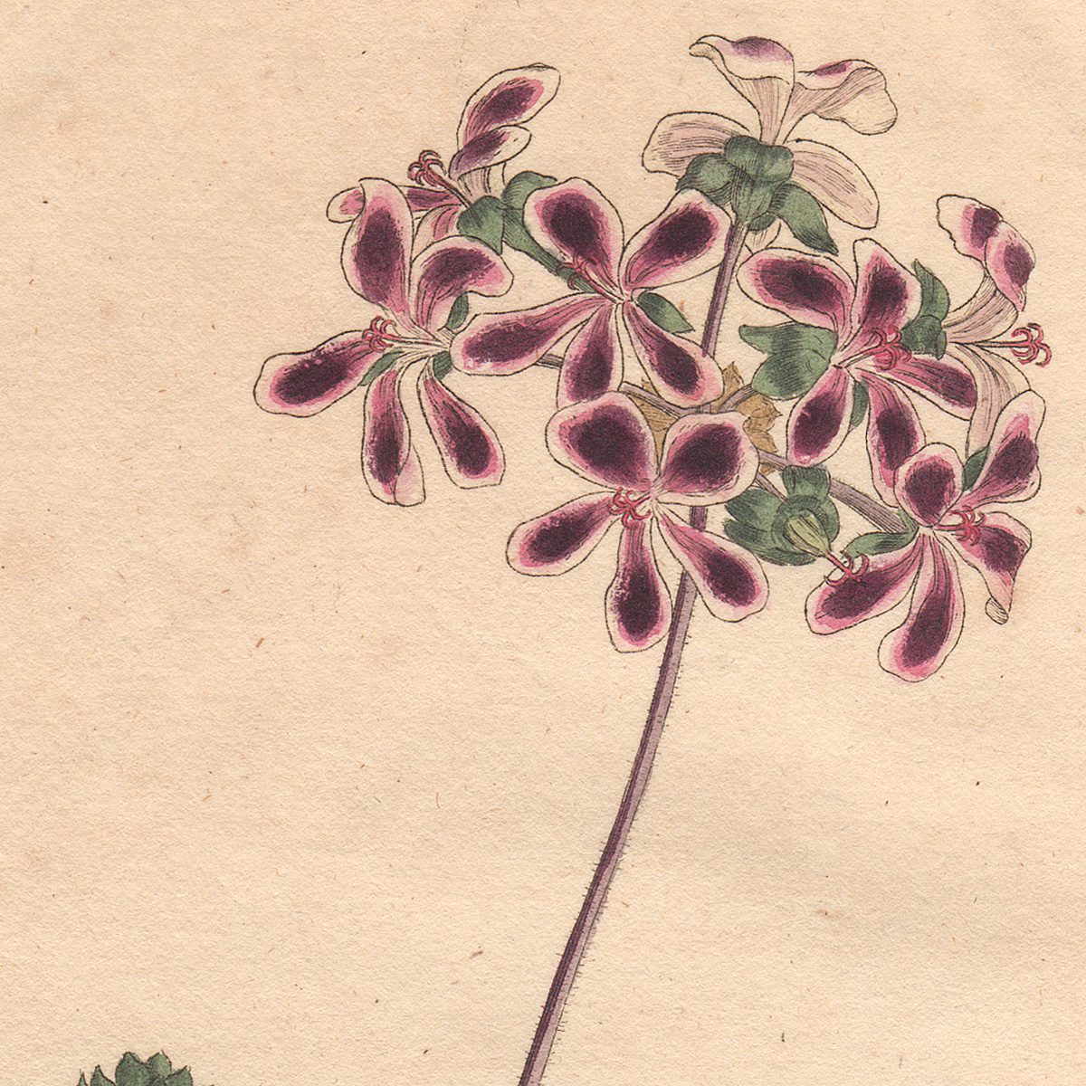 This original hand-colored engraving from The Botanical Magazine, or Flower-Garden Displayed created in 1794 by Sydenham Teast Edwards illustrates flowering plants.